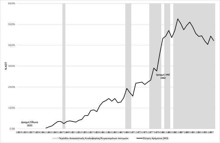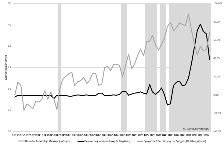 Κάτω από τις συνθήκες αυτές, η δραχμή, η οποία έως τη δεκαετία του 1880 διατηρούσε σταθερή ισοτιμία απέναντι στη στερλίνα, εισήλθε σε μία μακρά περίοδο υποτίμησης και δεν μπόρεσε να μετάσχει ούτε στον κανόνα χρυσού, που επικράτησε διεθνώς μετά την κατάρρευση του διμεταλλισμού το 1879. Παρά τη βούληση των ελληνικών κυβερνήσεων, η έγκαιρη ενσωμάτωση της δραχμής στο σύστημα αυτό στάθηκε αδύνατη. Η προσπάθεια επαναφοράς της μετατρεψιμότητας το 1885 απέτυχε και πάλι λόγω των μεγάλων δημοσιονομικών ελλειμμάτων που προκάλεσε η επιστράτευση (‘ειρηνοπόλεμος’).
