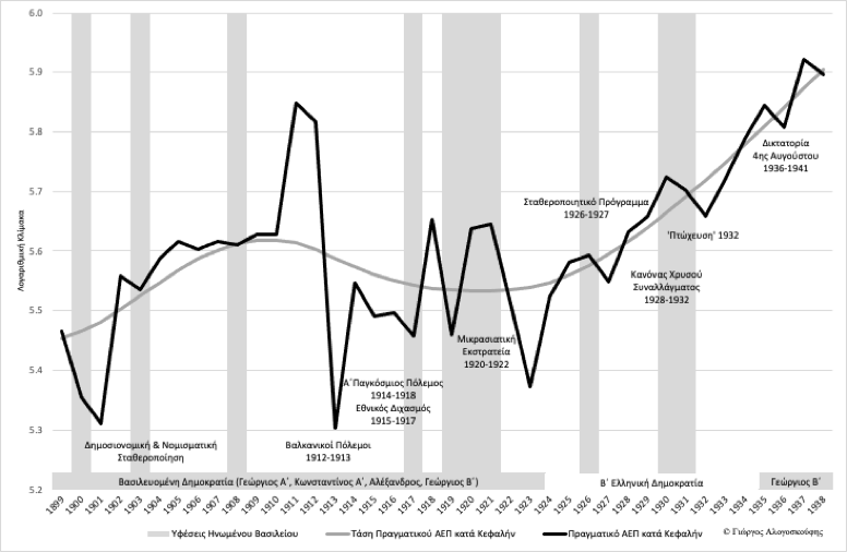 Παρά την πολιτική αστάθεια, τελικά η περίοδος του μεσοπολέμου αποδείχθηκε μία περίοδος συγκριτικά υψηλής οικονομικής μεγέθυνσης. Μεταξύ 1922 και 1937, το πραγματικό κατά κεφαλήν ΑΕΠ ανέβηκε κατά περίπου 40% (από $3129 το 1922 σε $4414 το 1937), σημειώνοντας μέσο ετήσιο ρυθμό μεγέθυνσης 2,4%.