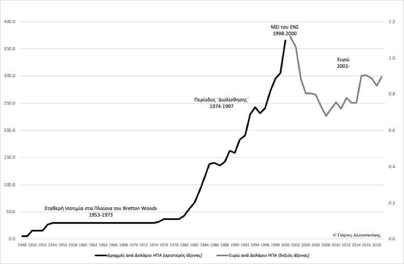 Η δραχμή, μετά την υποτίμηση του 1953 και τη νομισματική μεταρρύθμιση του 1954, συνδέθηκε στενά με το κυρίαρχο διεθνές νόμισμα, το δολάριο, και διατήρησε σταθερή την ισοτιμία της με αυτό για δύο ολόκληρες δεκαετίες (βλ. σχετικό γράφημα). Μέσω του δολαρίου, η σχέση της δραχμής διατηρήθηκε σταθερή και με το χρυσό, κάτι που αποτελούσε επιδίωξη της ελληνικής νομισματικής πολιτικής τουλάχιστον από το 1879. Η εσωτερική αξία της δραχμής επίσης διατηρήθηκε σχετικά σταθερή. Ο ετήσιος ρυθμός πληθωρισμού παρέμεινε σε πολύ χαμηλά επίπεδα, και η περίοδος 1953-1973 ήταν μία από τις σπάνιες περιόδους που ο μέσος ετήσιος πληθωρισμός στην Ελλάδα δεν υπερέβαινε τον πληθωρισμό των ανεπτυγμένων ευρωπαϊκών οικονομιών και των ΗΠΑ.