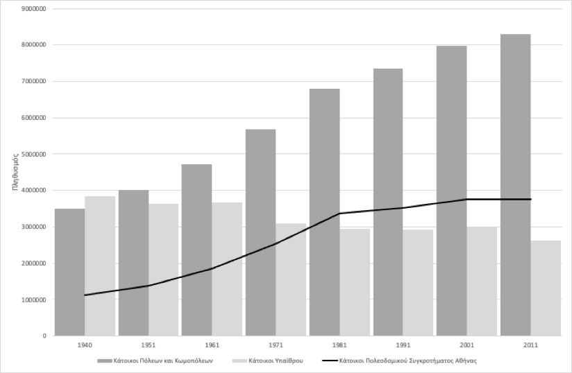 Η μετακίνηση από τις χαμηλής παραγωγικότητας αγροτικές ενασχολήσεις στην ύπαιθρο στις υψηλότερης παραγωγικότητας ενασχολήσεις στη μεταποίηση και τις υπηρεσίες στα αστικά κέντρα είναι βέβαιο ότι ενίσχυσε τη διαδικασία της ανάπτυξης, όπως άλλωστε συνέβη και στους δύο προηγούμενους ιστορικούς κύκλους. Ωστόσο, στην περίοδο από τον Εμφύλιο έως τις αρχές της δεκαετίας του 1970 οι μετακινήσεις προς τα αστικά κέντρα ήταν πραγματικά πρωτοφανείς (βλ. σχετικό γράφημα).
