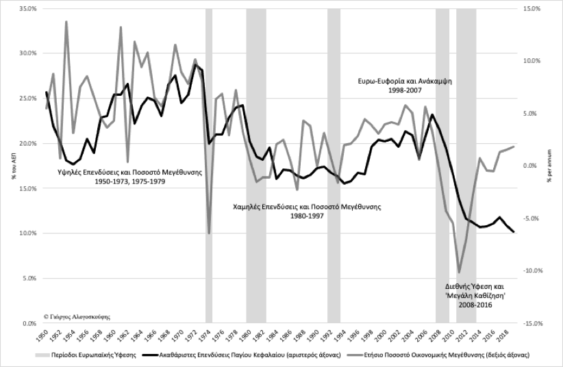 Η εξέλιξη των επενδύσεων παγίου κεφαλαίου σε σχέση με το ΑΕΠ απεικονίζεται στο γράφημα που ακολουθεί. Κατά την περίοδο 1950-1973, οι επενδύσεις ήταν κατά μέσο όρο ίσες με το 23,5% του ΑΕΠ. Ως αποτέλεσμα, ο μέσος ετήσιος ρυθμός αύξησης του ΑΕΠ αυξήθηκε σε 7,4%. Ποτέ πριν ή μετά δεν γνώρισε η Ελλάδα τόσο υψηλούς ρυθμούς ανάπτυξης για τόσο μεγάλο χρονικό διάστημα.