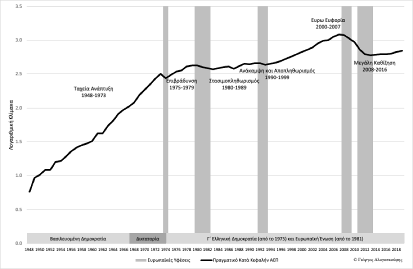 Στα είκοσι πέντε έτη μεταξύ 1948 και 1973, το βιοτικό επίπεδο, όπως μετριέται από το πραγματικό κατά κεφαλήν ΑΕΠ, αυξήθηκε σχεδόν έξι φορές. Για να είμαστε πιο ακριβείς, αυξήθηκε κατά 5,7 φορές, από 2.138 ευρώ (σε τιμές 2015) το 1948, σε 12.235 ευρώ το 1973. Οι μεγαλύτερες αυξήσεις πραγματοποιήθηκαν στην εικοσαετία 1953-1973 (βλ. σχετικό γράφημα).
